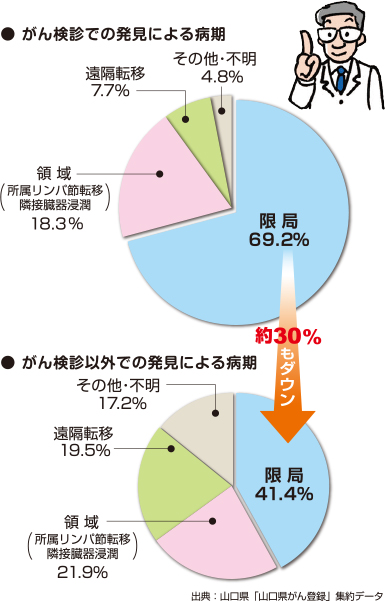 がん検診により、約7割が、がんの発生臓器内に止まっている「限局」の状態、つまり早期がんで発見されていますが、検診以外での発見は、約4割と低くなっています。