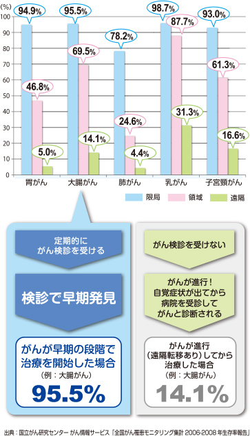 しかし診断と治療の進歩により、一部のがんでは早期発見、早期治療が可能となってきました。がん検診はこうした医療技術に基づき、がんの死亡率を減少させることができる確実な方法です。